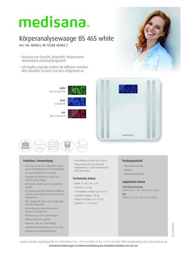 Medisana BS 465 Waga z analizą składu ciała Zakres pomiaru maks.=180 kg biały