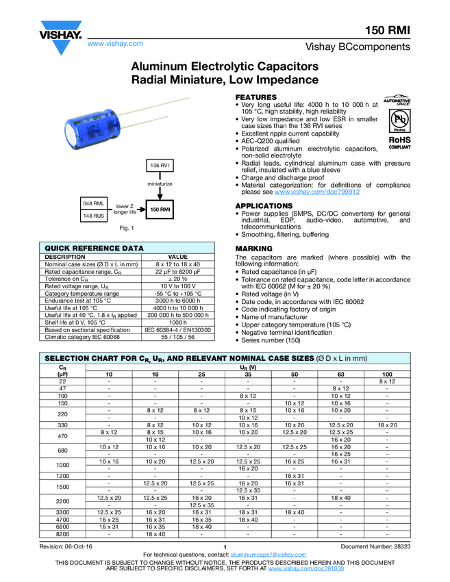 Cap Aluminum 47uF 63V 20% (8 X 12mm) Radial 3.5mm 405mA 4000 hr 105°C Ammo Pack