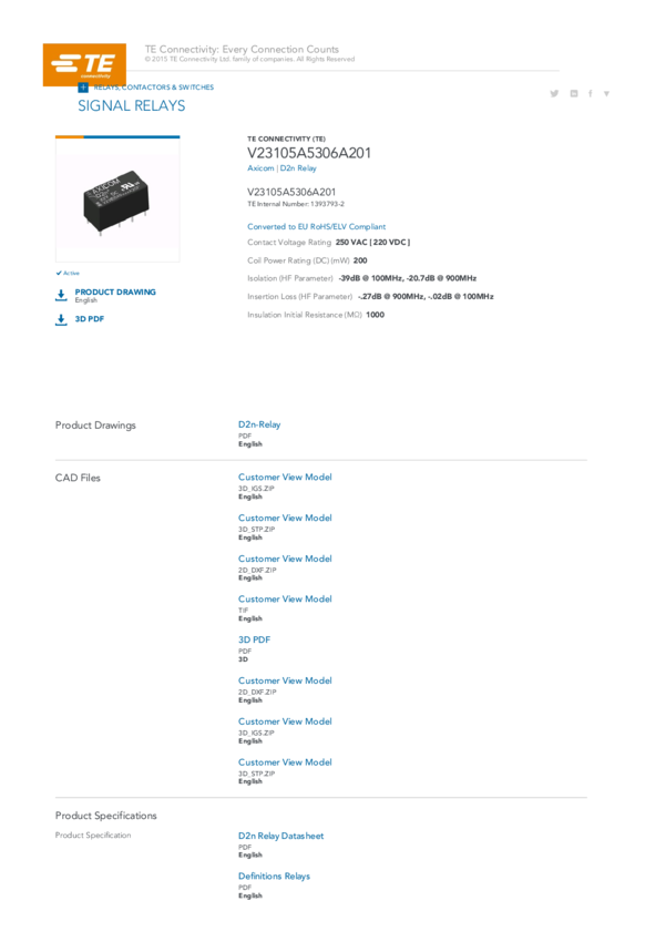 Electromechanical Relay DPDT 3A 9VDC 405Ohm Through Hole