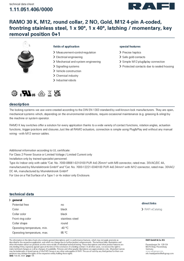 RAFI 1.11.051.406/0000 RAMO 30 Przełącznik kluczykowy 32 V 0.1 A zatrzask, chwilowy (D x S x W) 34.5 x 34.5 x 75.1 mm 1