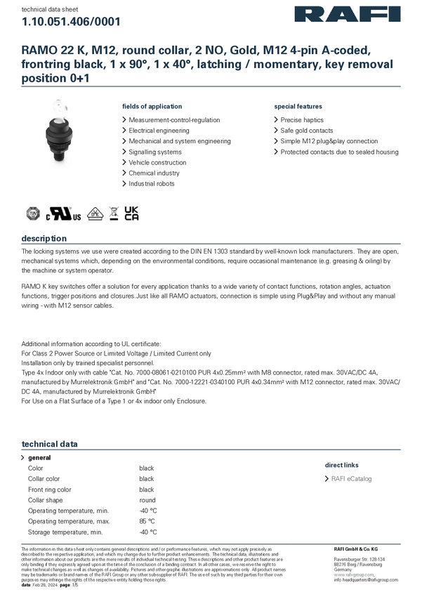 RAFI 1.10.051.406/0001 RAMO 22 Przełącznik kluczykowy 32 V 0.1 A zatrzask, chwilowy (D x S x W) 29.8 x 29.8 x 75.1 mm 1