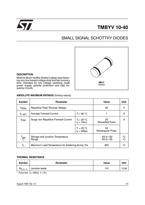Dioda; prostownicza; TMBYV10-40FILM; Schottky; 1A; 40V; MELF (DO-213AB); SMD; STMicroelectronics; RoHS; op/100szt