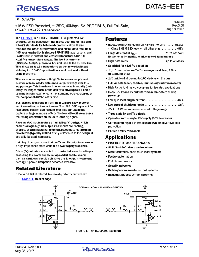 ±15kV ESD Protected, +125°C, 40Mbps, 5V, PROFIBUS, Full Fail-safe, RS-485/RS-422 Transceivers