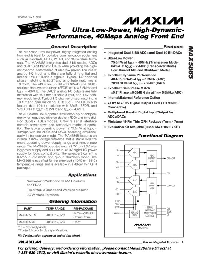 MAX5865 Ultra-Low-Power, High Dynamic Performance 40Msps Analog Front End
