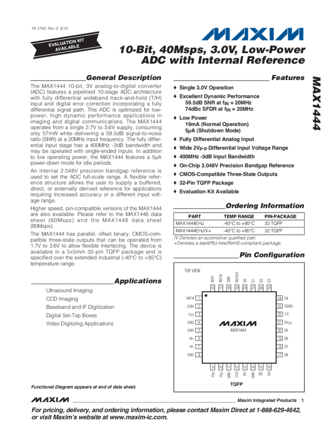 MAX1444 10-Bit, 40Msps, 3V, Low-Power ADC with Internal Reference
