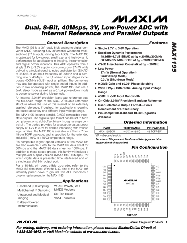 MAX1195 Dual, 8-Bit, 40Msps, 3V, Low-Power ADC with Internal Reference and Parallel Outputs