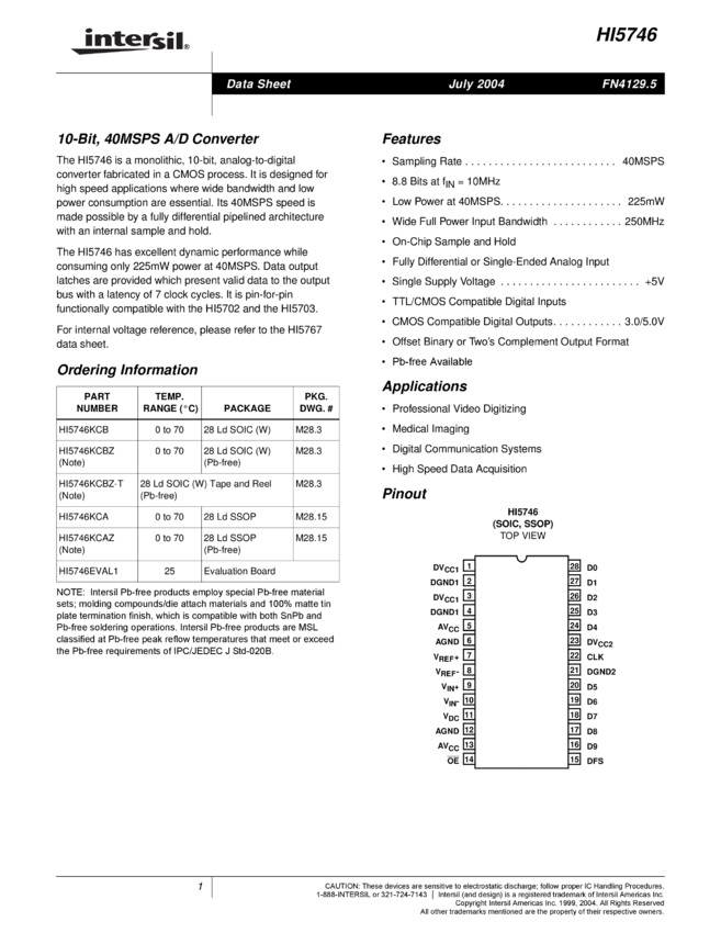 10-Bit, 40MSPS A/D Converter with CMOS Outputs