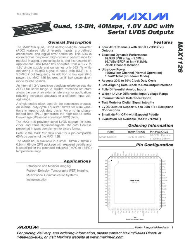 MAX1126 Quad, 12-Bit, 40Msps, 1.8V ADC With Serial LVDS Outputs