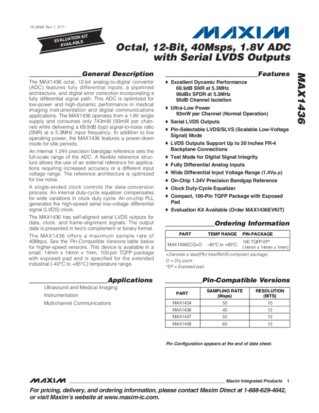 MAX1436B Octal, 12-Bit, 40Msps, 1.8V ADC With Serial LVDS Outputs