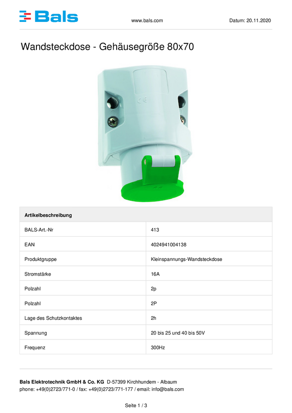 Gniazdo naścienne CEE Bals Elektrotechnik 413 16.0 A 50 V