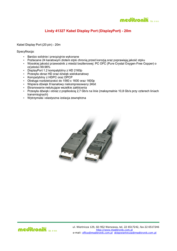 Lindy 41327 kabel Displayport 1.2 wtyk/wtyk 4K wysoka jakość długość 20m