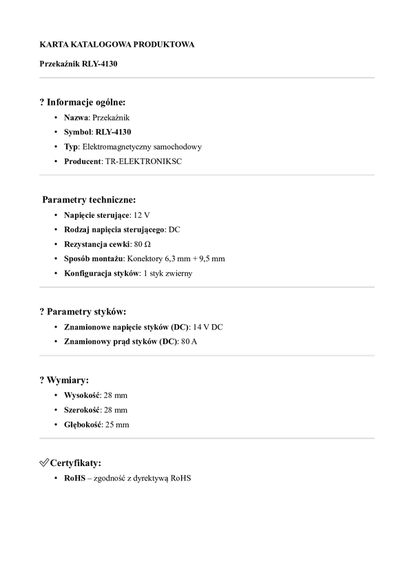 Przekaźnik; elektromagnetyczny; samochodowy; 24V DC; 80A; 1 styk zwierny SPST-NO; RLY-4130; RoHS