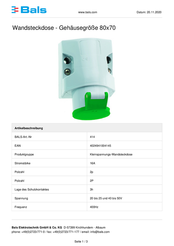 Gniazdo naścienne CEE Bals Elektrotechnik 414 16.0 A 50 V