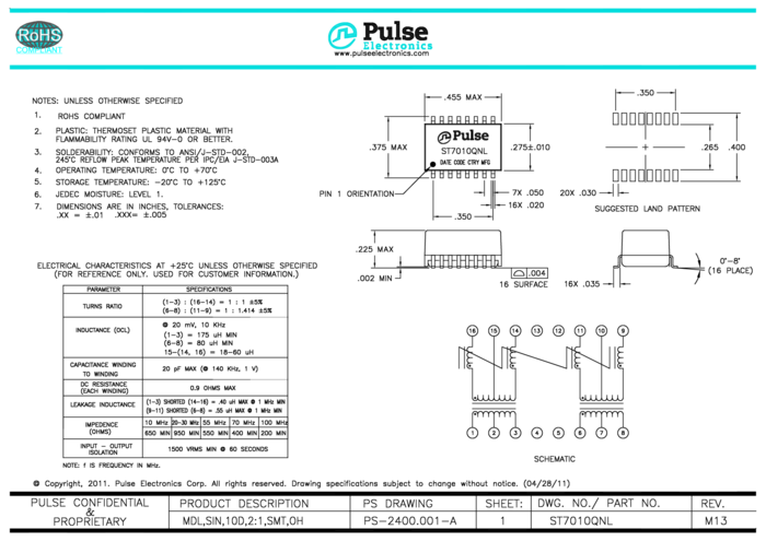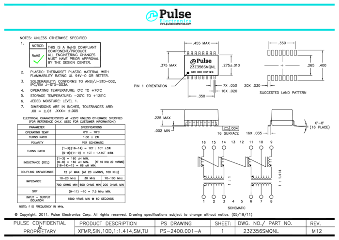 Telecom Transformer 1:1.414/1:1 1500Vrms -2dB Surface Mount