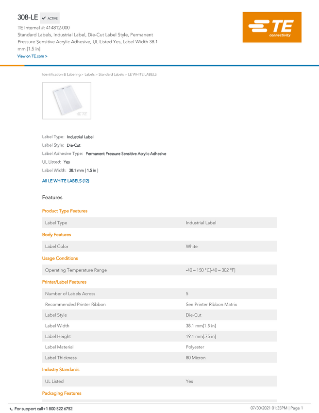 TE Connectivity 414812-000 TE RAY Labels - Standard