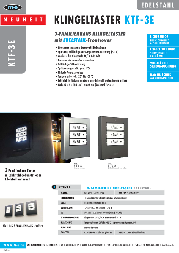 Przycisk do dzwonka m-e modern-electronics KTF-3 EG, IP54, stali szlachetnej (szczotkowanej)