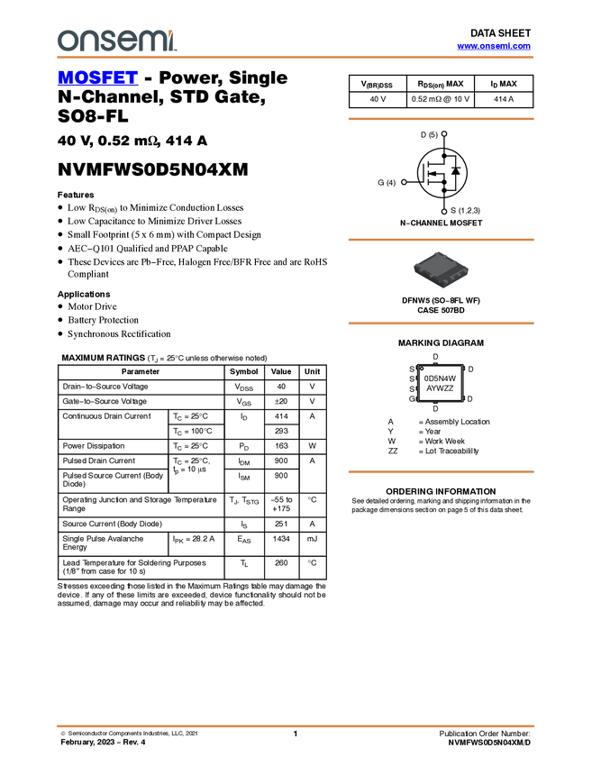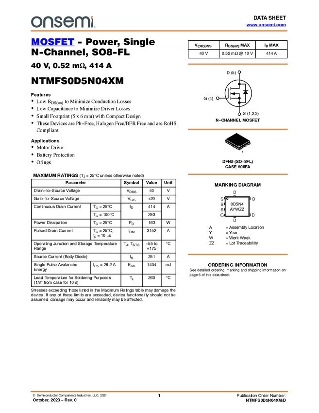 Power MOSFET, Single, N-Channel, 40V, 0.52mΩ, 414A, SO8-FL 5x6