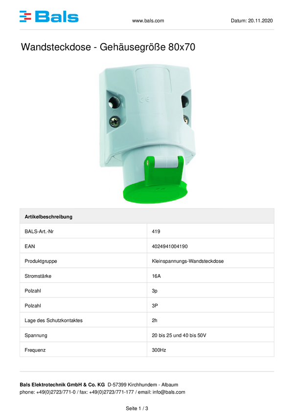 Gniazdo naścienne CEE Bals Elektrotechnik 419 16.0 A 50 V