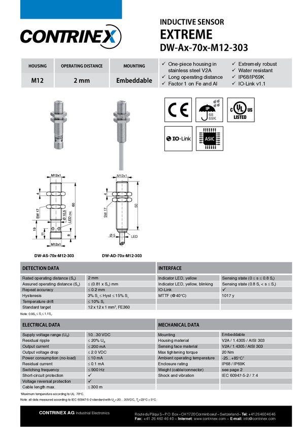Czujnik indukcyjny Contrinex DW-AS-701-M12-303, 10 - 30 V, IP67/IP69K, 1 szt.