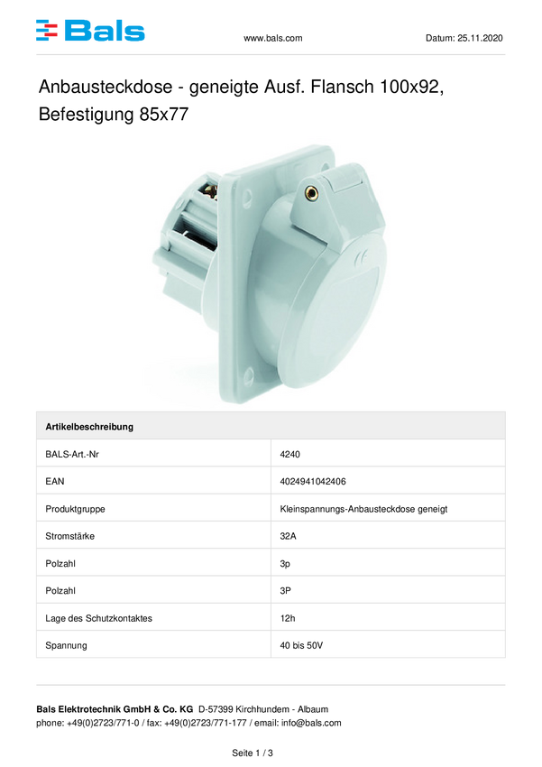 Puszka montażowa CEE Bals Elektrotechnik 4240 32.0 A 50 V