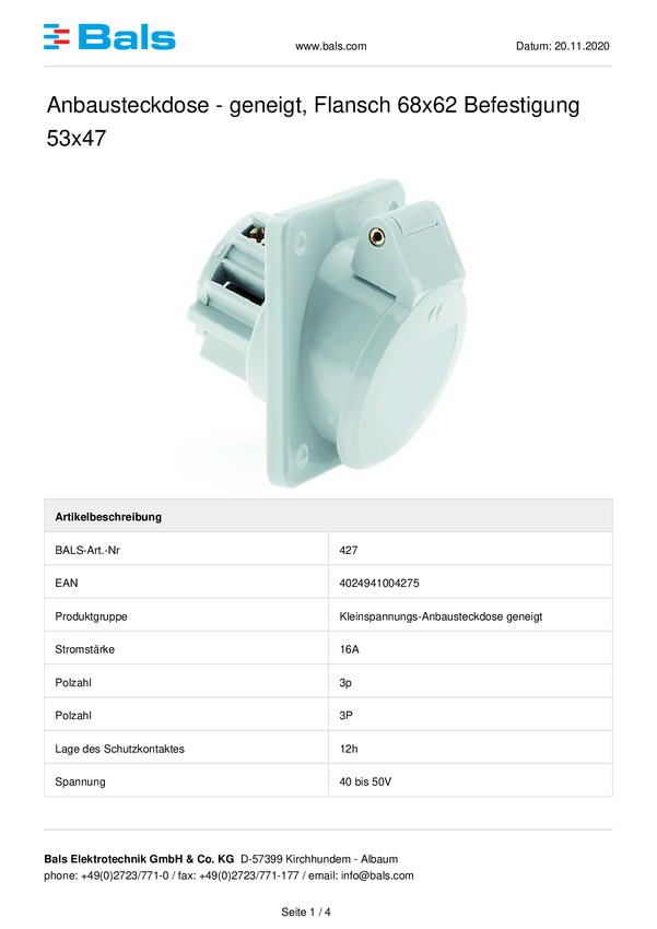 Puszka montażowa CEE Bals Elektrotechnik 427 16.0 A 50 V
