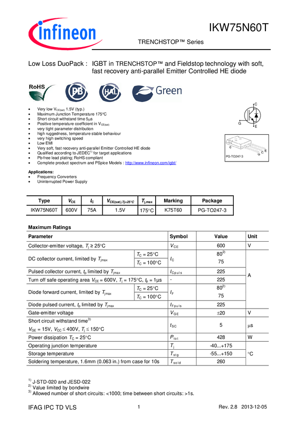 Tranzystor; IKW75N60T; IGBT; 75A; 600V; 428W; TO247; THT; ON-Semicoductor ; IKW75N60TFKSA1; RoHS