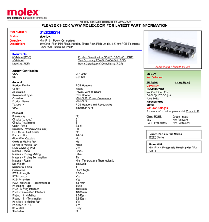 Molex 428206214 Listwa kołkowa, męska, do wbudowania, standardowa, piny: 6, 1 szt.