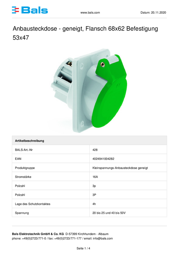 Puszka montażowa CEE Bals Elektrotechnik 428 16.0 A 50 V
