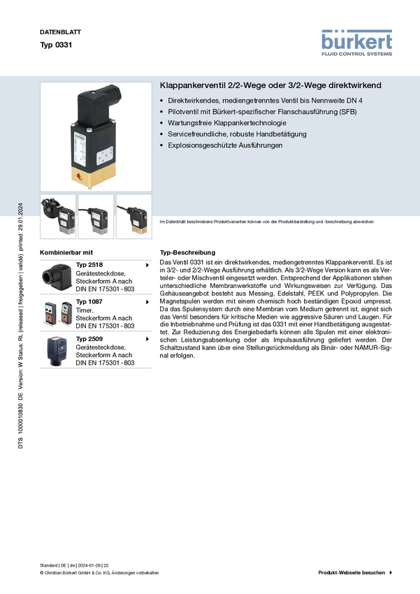 Zawór magnetyczny Bürkert 0331 42991, 0 bar (max)