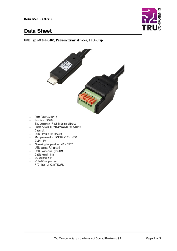 TRU COMPONENTS TC-KW-429 Konwerter szeregowy USB, RS-485 Ilość wejść: 1 x Ilość wyjść: 1 x 1 szt.