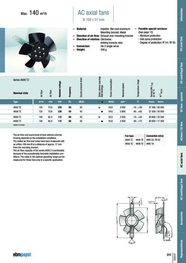 Wentylator typu Tubeaxial AC 230V gł.zew. 37mm; 230V AC; 125m3/h; 42dBA; łożysko okrągłe; średnica łopatek 108 mm; rozstaw śrub 148,2mm; listwa mocująca szer 16mm dł.160mm