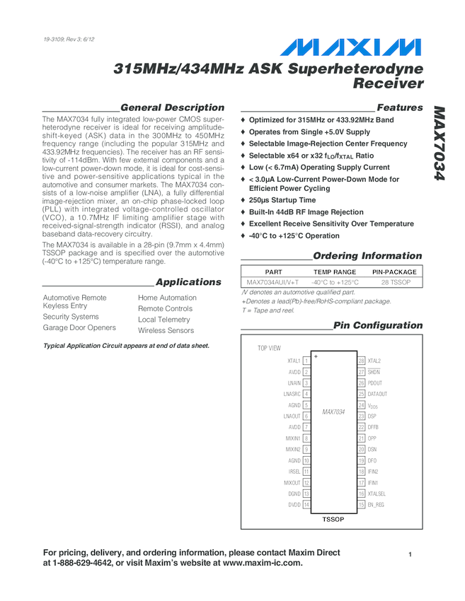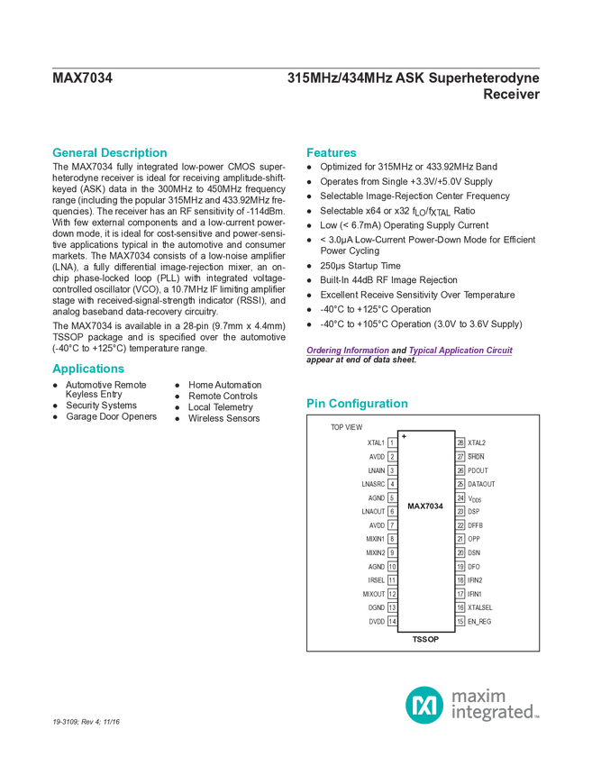MAX7034 315MHz/434MHz ASK Superheterodyne Receiver