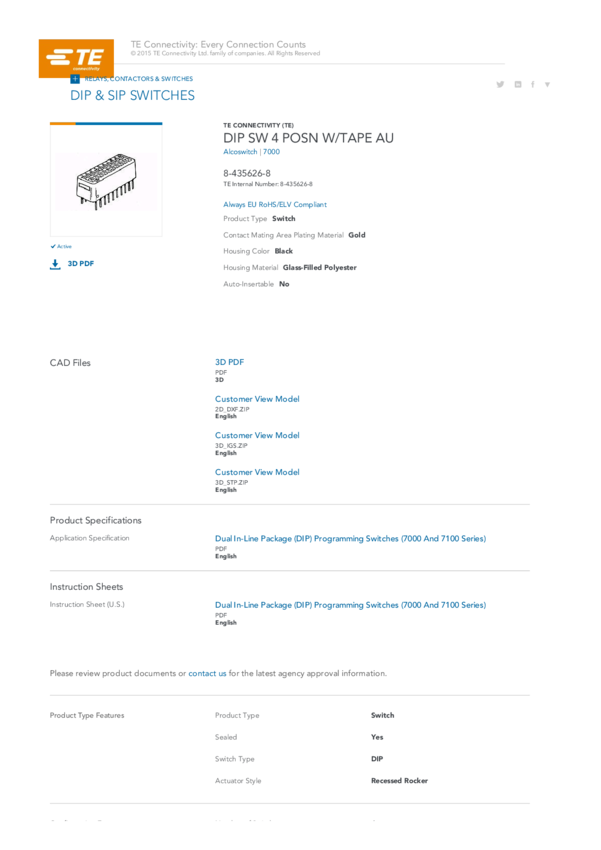 Switch DIP OFF ON SPST 4 Raised Rocker 0.06A 24VDC PC Pins 2.54mm Thru-Hole Loose Piece