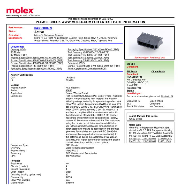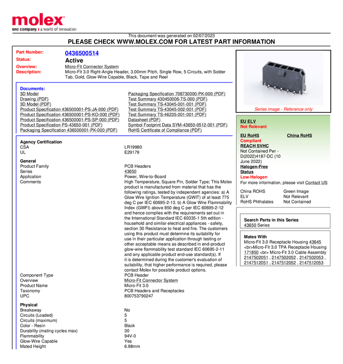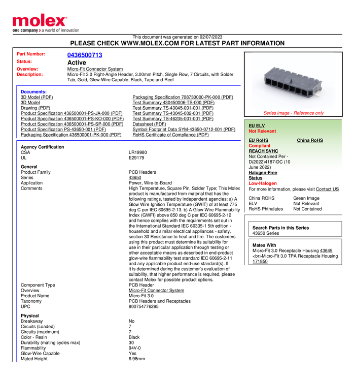 Molex 436500713 Listwa kołkowa, męska, do wbudowania, standardowa, piny: 7, 1 szt.
