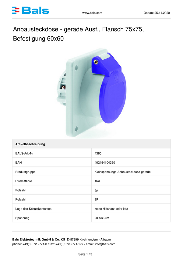 Puszka montażowa CEE Bals Elektrotechnik 4360 16.0 A
