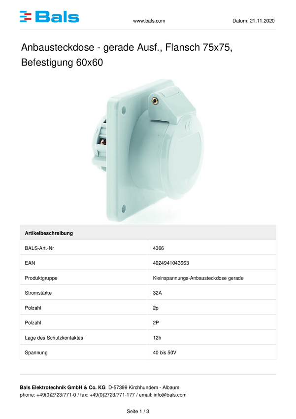 Puszka montażowa CEE Bals Elektrotechnik 4366 32.0 A 50 V