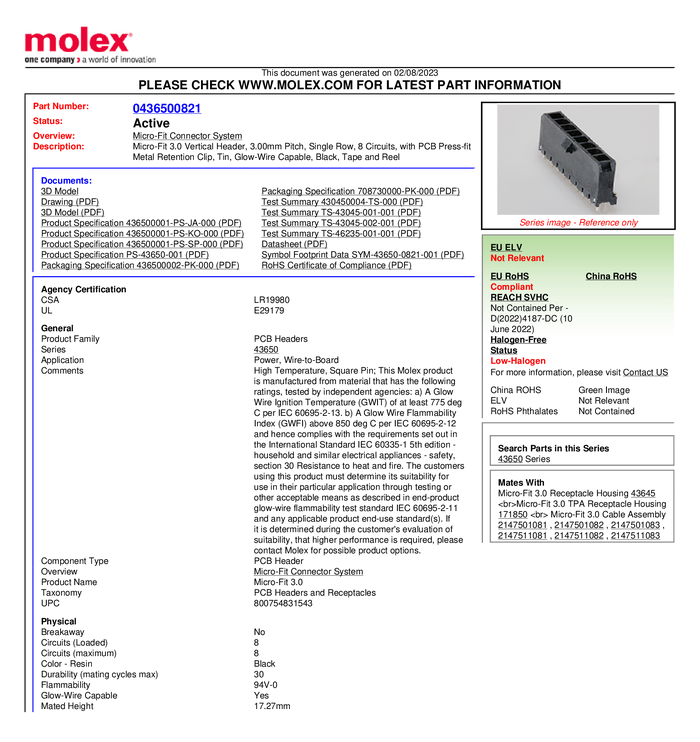 Molex 436500821 Listwa kołkowa, męska, do wbudowania, standardowa, piny: 8, 1 szt.
