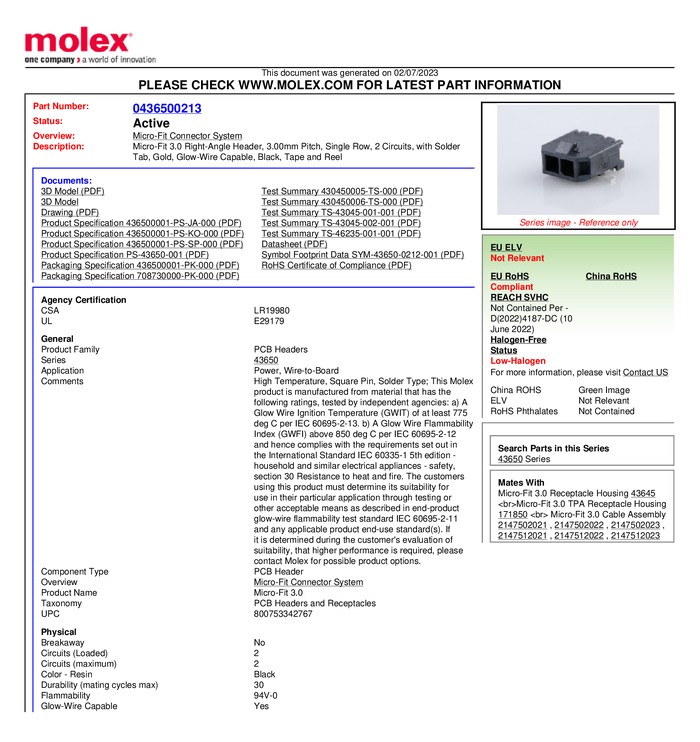 Molex Listwa kołkowa, męska, do wbudowania, standardowa Ilość pinów 2 Wymiary siatki: 3.00 mm 436500213 1 szt. taśma na