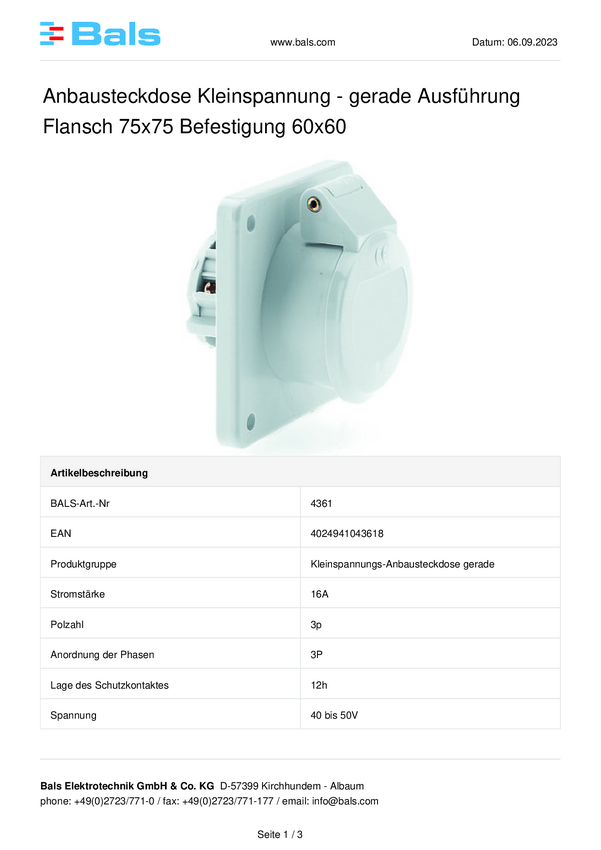 Puszka montażowa CEE Bals Elektrotechnik 4361 16.0 A 50 V