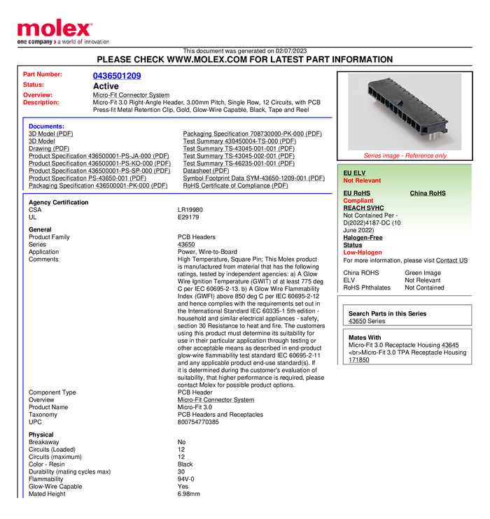 Molex 436501209 Listwa kołkowa, męska, do wbudowania, standardowa, piny: 12, 1 szt.
