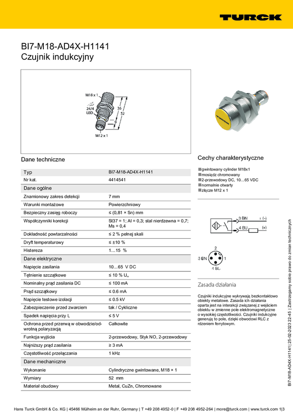 Czujnik indukcyjny Turck BI7-G18K-AD4X, 10 - 65 V, 1 szt.
