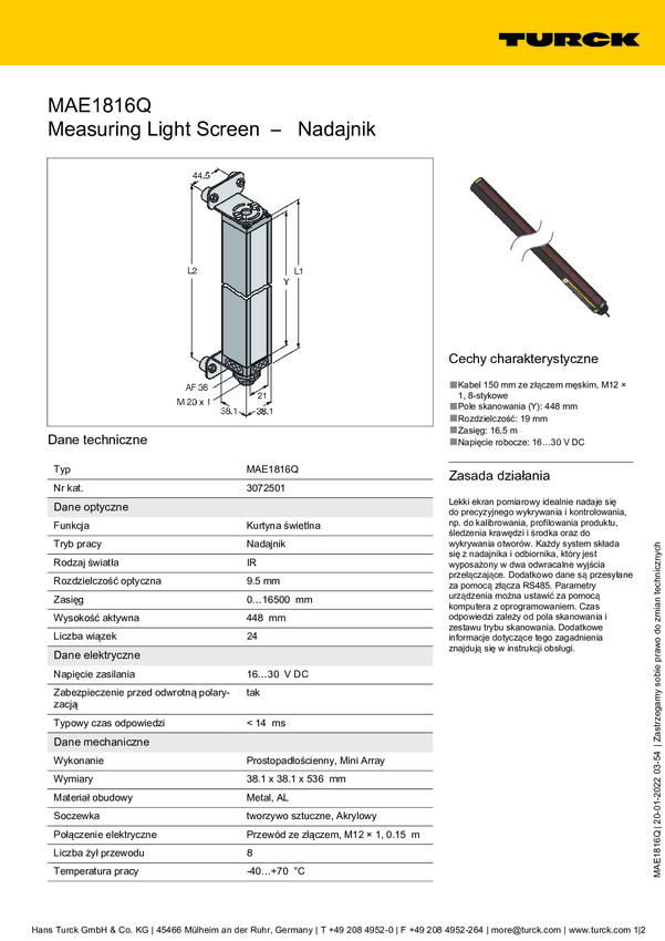 Turck Kurtyna świetlna MAE1816Q Wysokość ochronna 448 mm