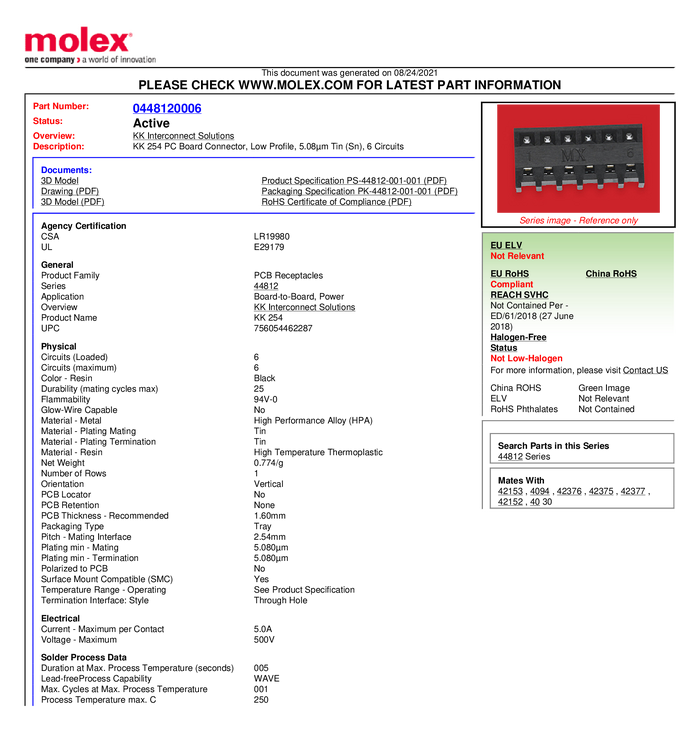 Molex Listwa kołkowa, żeńska, do wbudowania, standardowa Ilość pinów 6 Wymiary siatki: 2.54 mm 448120006 1 szt. paleta
