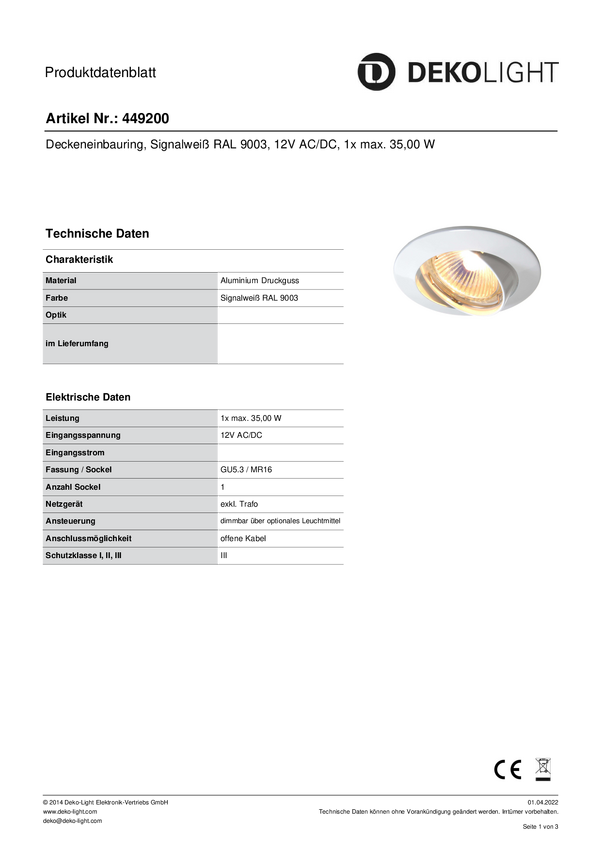 Lampa sufitowa, pierścień Deko Light Einbauring 68 GU5.3 449200 12 V/AC, 12 V/DC 35 W GU5.3, MR 16