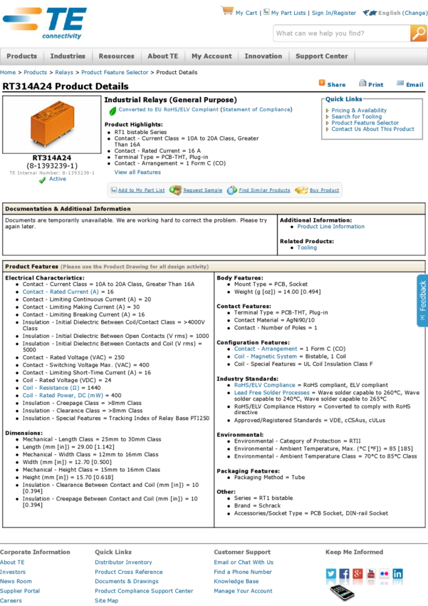 Electromechanical Relay SPDT 16A 24VDC 1.44KOhm Plug-In