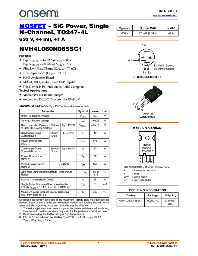 Silicon Carbide (SiC) MOSFET, N‐Channel - EliteSiC, 44mohm, 650V, M2, TO247−4L