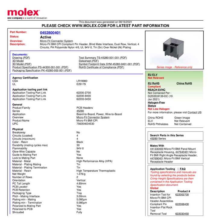Molex 452800401 Listwa kołkowa, męska, do wbudowania, standardowa Molex MOL Power & Signal Sol., piny: 4, 8.5 A, 1 szt.