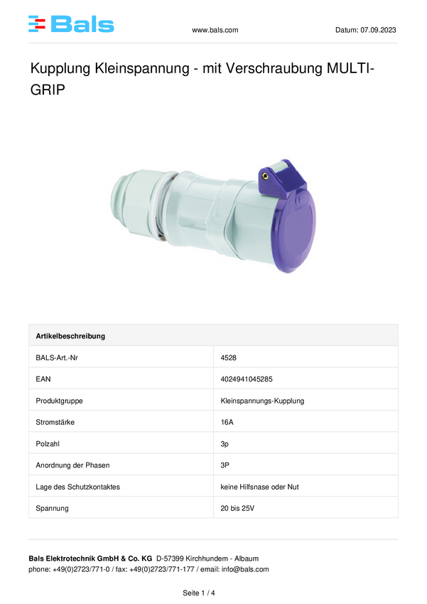 Łacznik CEE Bals Elektrotechnik 4528 16.0 A