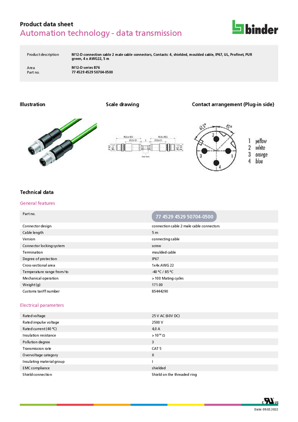 binder 77 4530 4529 50704-0500-20 Złącze konfekcjonowane czujnika/aktuatora złącze żeńskie proste, złącze męskie proste