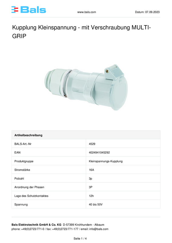 Łacznik CEE Bals Elektrotechnik 4529 16.0 A 50 V